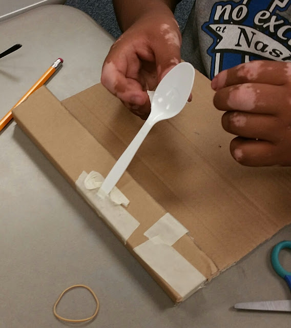 Our task was to improve a handheld plastic spoon catapult by turning it into a freestanding one.